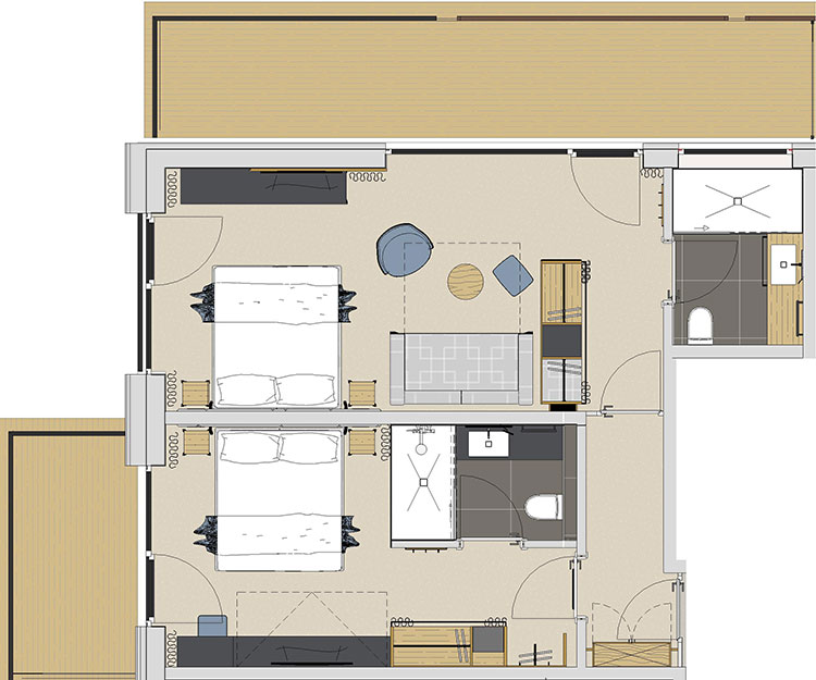 sehr stilvolles, modernes Doppelzimmer mit Sitzecke und Teppichboden